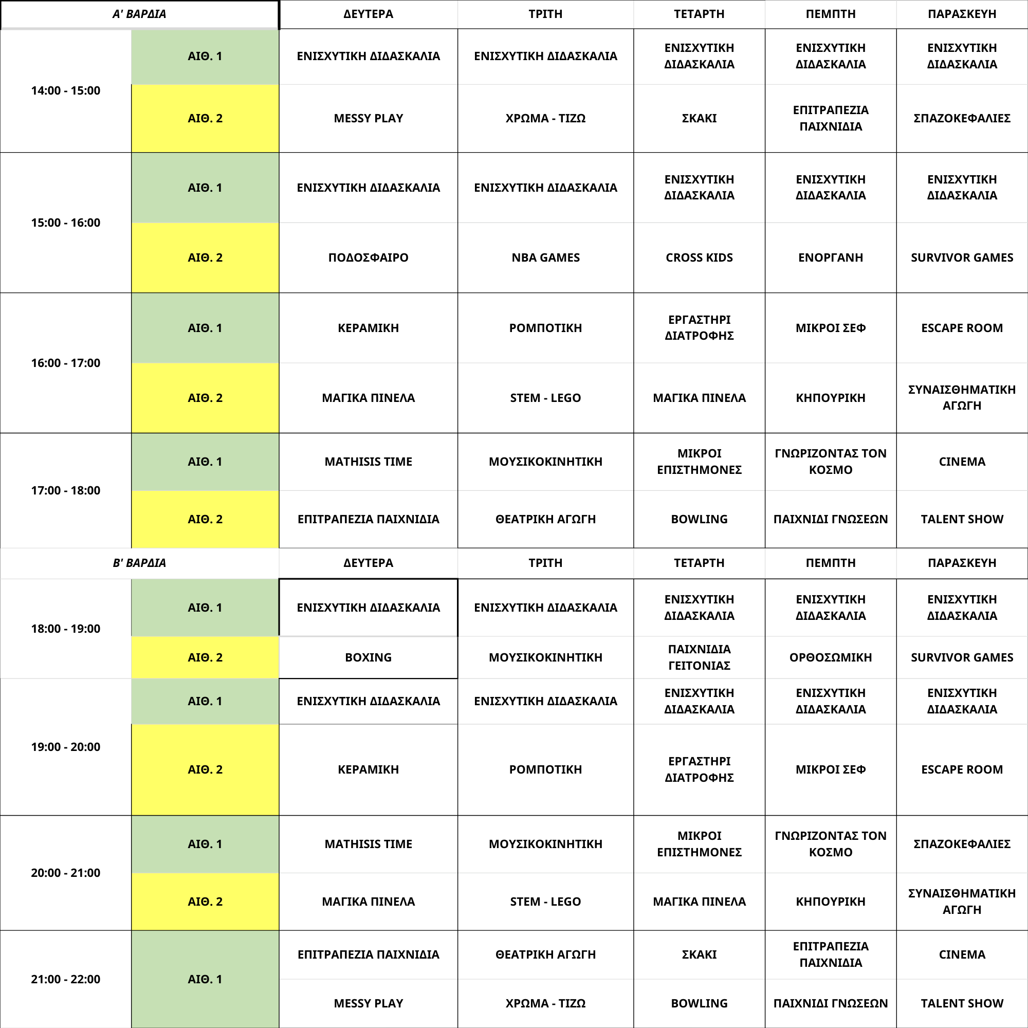 Μέσα από ποικίλες δραστηριότητες, τα παιδιά έχουν την ευκαιρία να αναπτύξουν τις δεξιότητές τους, να εκφράσουν τη δημιουργικότητά τους, να συνεργαστούν με τους φίλους τους και να ανακαλύψουν νέες εμπειρίες μέσα από το παιχνίδι, τη μάθηση και τη φαντασία.